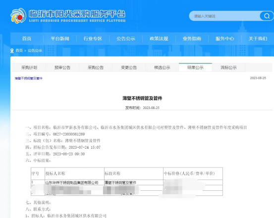 8月25日,臨沂市陽光采購服務平臺發布臨沂市羅新水務有限公司、臨沂市水務集團城區供水有限公司薄壁不銹鋼管及管件年度采購項目招標結果,據顯示,山東華燁集團成功中標。