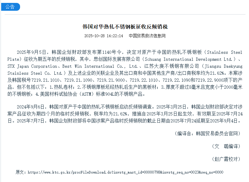 2025年10月28日,據(jù)中國貿(mào)易救濟信息網(wǎng)一則公告《韓國對華熱軋不銹鋼板征收反傾銷稅》顯示,“2025年9月5日,韓國企劃財政部發(fā)布第1140號令,決定對原產(chǎn)于中國的熱軋不銹鋼板(Stainless Steel Plate)征收為期五年的反傾銷稅,其中,思創(chuàng)國際發(fā)展有限公司(Schuang International Development Ltd.)、STX Japan Corporation、Best Win International Co., Ltd.、江蘇大庚不銹鋼有限公司(Jiangsu Daekyung Stainless Steel Co. Ltd.)及上述企業(yè)的關(guān)聯(lián)企業(yè)及其出口商和中國其他生產(chǎn)商/出口商稅率均為21.62%。本案涉及韓國稅號7219.21.1010、7219.21.1090、7219.21.9000、7219.22.1010、7219.22.1090和7219.22.9000項下的產(chǎn)品,但不包括以下:1.熱軋卷材;2.不銹鋼厚板坯經(jīng)熱軋后生產(chǎn)的黑板材;3.厚度不超過8毫米且寬度小于2000毫米的不銹鋼板;4.美國材料試驗協(xié)會(ASTM)標(biāo)準(zhǔn)904L的不銹鋼產(chǎn)品。”