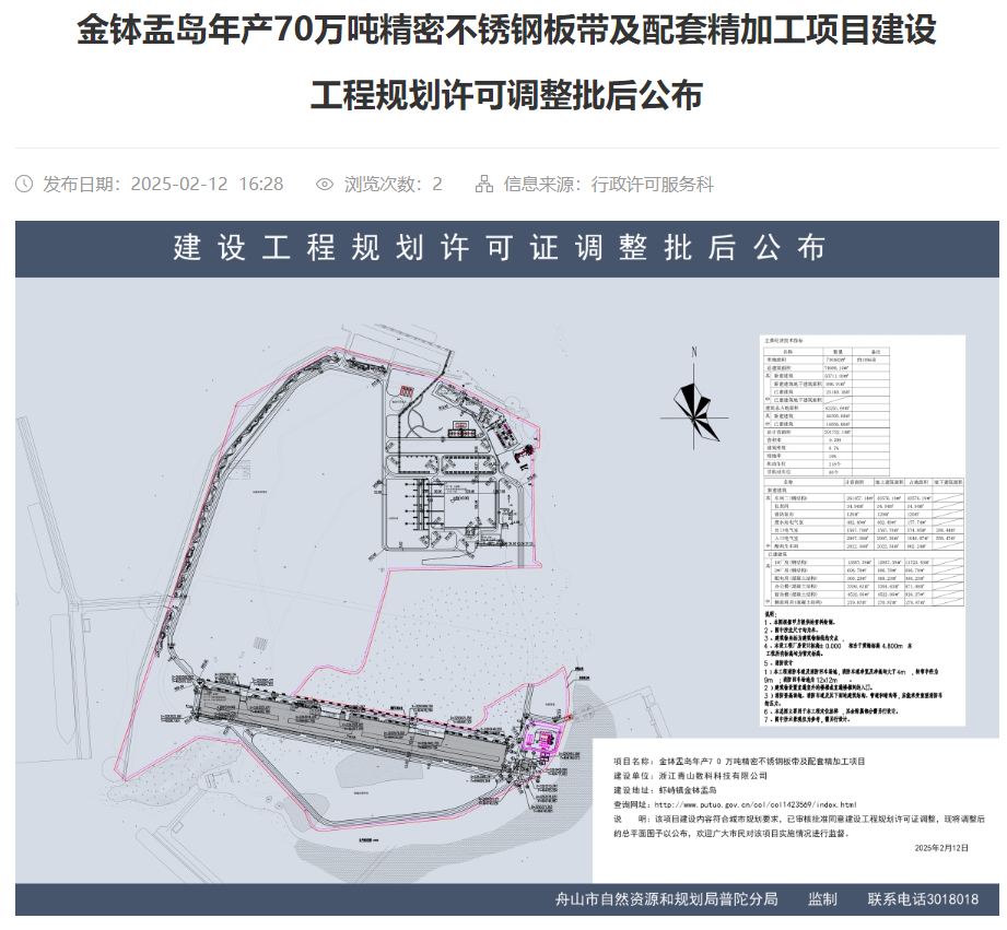 2025年2月12日,金缽盂島年產(chǎn)70萬噸精密不銹鋼板帶及配套精加工項(xiàng)目建設(shè)工程規(guī)劃許可調(diào)整批后公布。