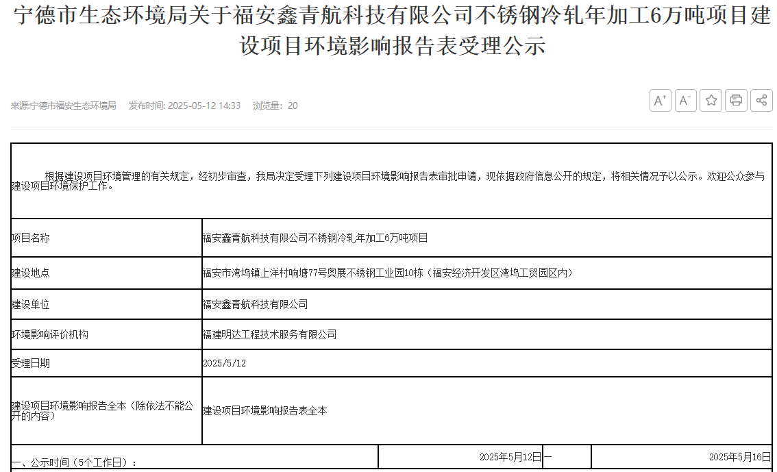 2025年5月12日,寧德市生態(tài)環(huán)境局受理福安鑫青航科技有限公司不銹鋼冷軋年加工6萬噸項目建設(shè)項目環(huán)境影響報告表并對外進(jìn)行公示,公示期:5個工作日。