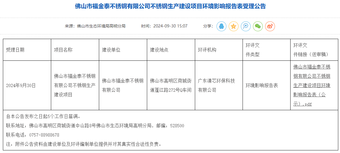 9月30日,佛山市生態環境局高明分局受理佛山市福金泰不銹鋼有限公司不銹鋼生產建設項目環境影響報告表并對外進行公告,公告期:自本公告發布之日起5個工作日屆滿。