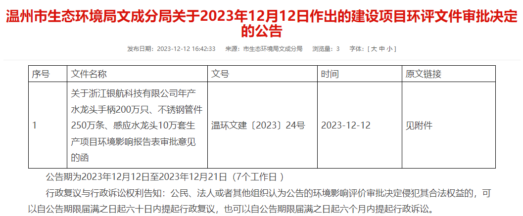 12月12日,溫州市生態環境局文成分局就浙江銀航科技有限公司年產水龍頭手柄200萬只、不銹鋼管件250萬條、感水水龍頭10萬套生產項目環境影響報告表作出審批決定并對外進行公告,公告期為2023年12月12日至2023年12月21日(7個工作日 ) 。