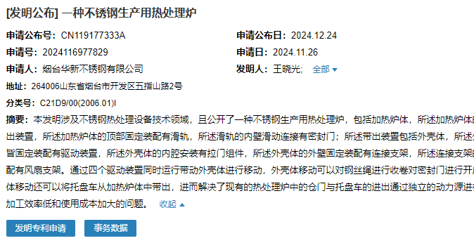 2024年12月24日,煙臺華新不銹鋼有限公司成功申請一項(xiàng)名為“一種不銹鋼生產(chǎn)用熱處理爐”專利,申請公布號為CN119177333A,申請日期為2024年11月26日。